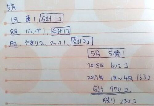 1000個捨てチャレンジ 5月は5個でした。 少なすぎ! 1000個捨てチャレンジ 5月分 しかも、そのうちの1個は先月の車。 でも今月は燃えてます。もう1個断捨離しましたからね。行き詰まりを感じると、断捨離したくなります。 残り230個かー。1000個捨てチャレ…